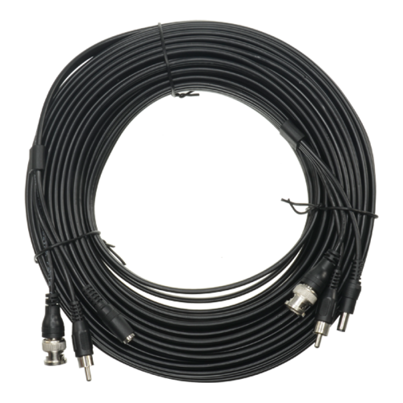 Cable combinado mini RG59, con cable de audio para línea, más un cable para la alimentación DC. Formato de manguera plana para reducir el grosor del conjunto y facilitar la instalación. Bajas pérdidas. Longitud fija de 20 metros, con conector macho-macho BNC (vídeo), macho-macho RCA (audio) y hembra-macho Jack (alimentación) en los extremos.
