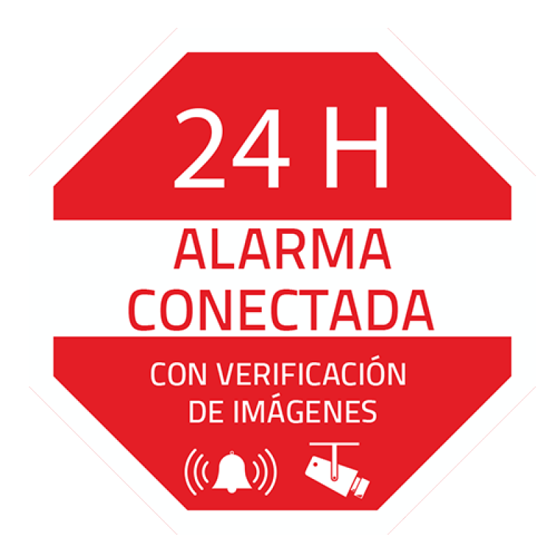 Serigrafía de Alarma conectada 24 H con verificación de imágenes. Elemento aconsejable en toda instalación CCTV por su efecto disuasorio.