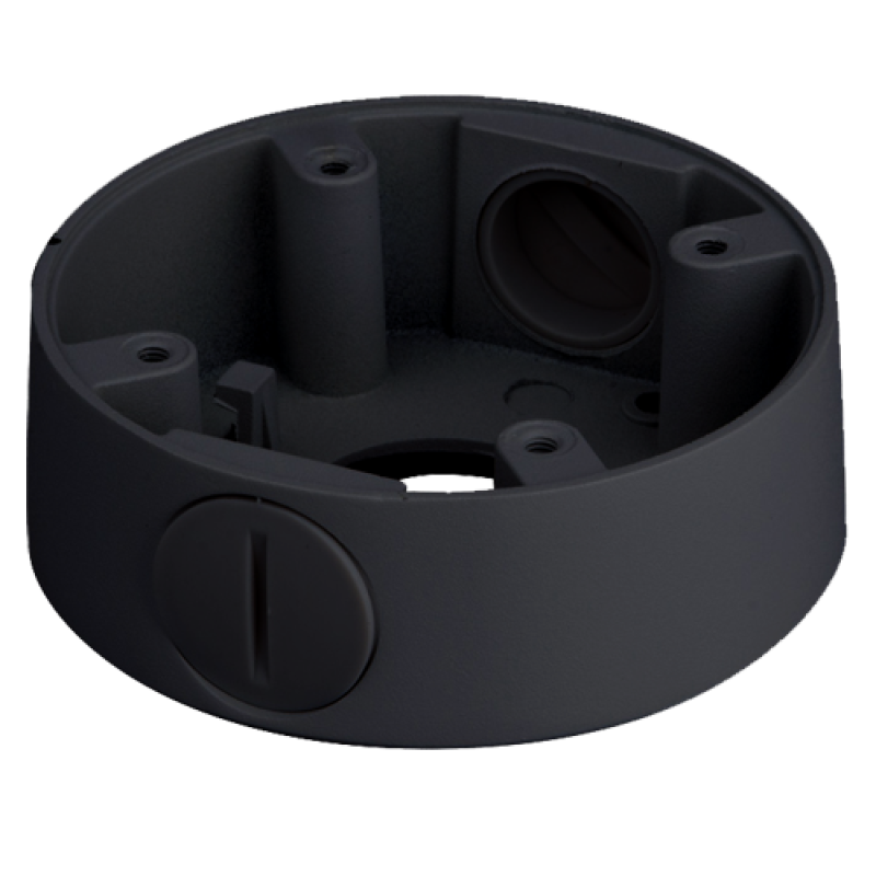 Permite alojar el alimentador, el cableado y los accesorios de la instalación en su interior. Dispone de múltiples orificios para instalación de diferentes tipos de cámaras domo. Fijación a pared o techo a través de 3 tornillos incluídos. La cámara queda instalada en la cubierta desmontable del soporte. Permite el paso interno del cableado.