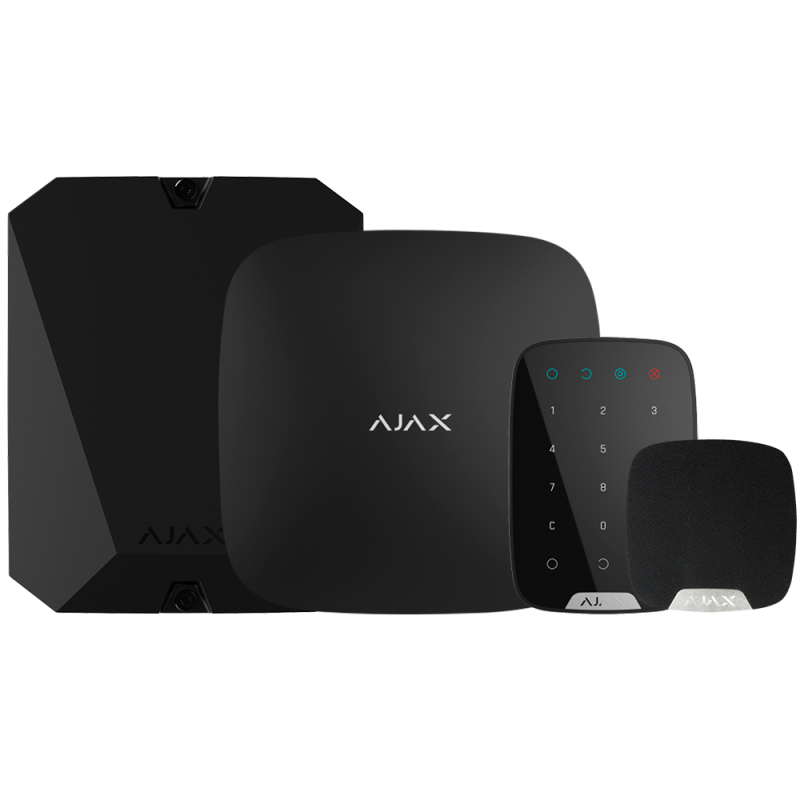El kit incluye el panel de control AJ-HUB-B, un módulo de integración AJ-MULTITRANSMITTER-3EOL-B, un teclado inalámbrico AJ-KEYPAD-B y una sirena interior AJ-HOMESIREN-B.
