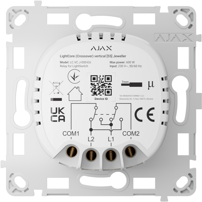| Marca | Ajax - LightSwitch LightCore Vertical (Crossover) | | Función | Relé para interruptor de luz inteligente de cruce vertical |